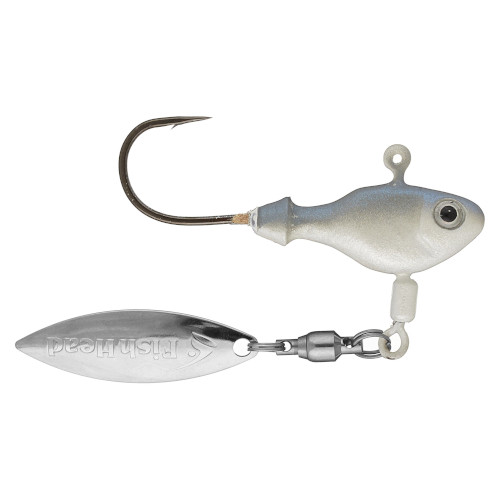 The Fish Head Underspins made a big name for themselves in early '05 when a famous Western Pro used the jig head to take a strong second place finish by swimming the Hornet/Fluke Jr. combo. The Fish Head Underspin features chip resistant paint, a conical bait keeper, and a quality ball bearing swivel to enable the blade to spin easily at any retrieve speed. Fish Head uses a top quality Mustad Ultrapoint hook that will hook and hold any bass that bites. Fish Head Underspins work well when fished over deep cover like brush piles, around standing cover like bridge pilings and standing timber, and along weed edges anywhere in the US. Use any single or double tail grub or the Super Fluke or Super Fluke Jr. as a trailer.