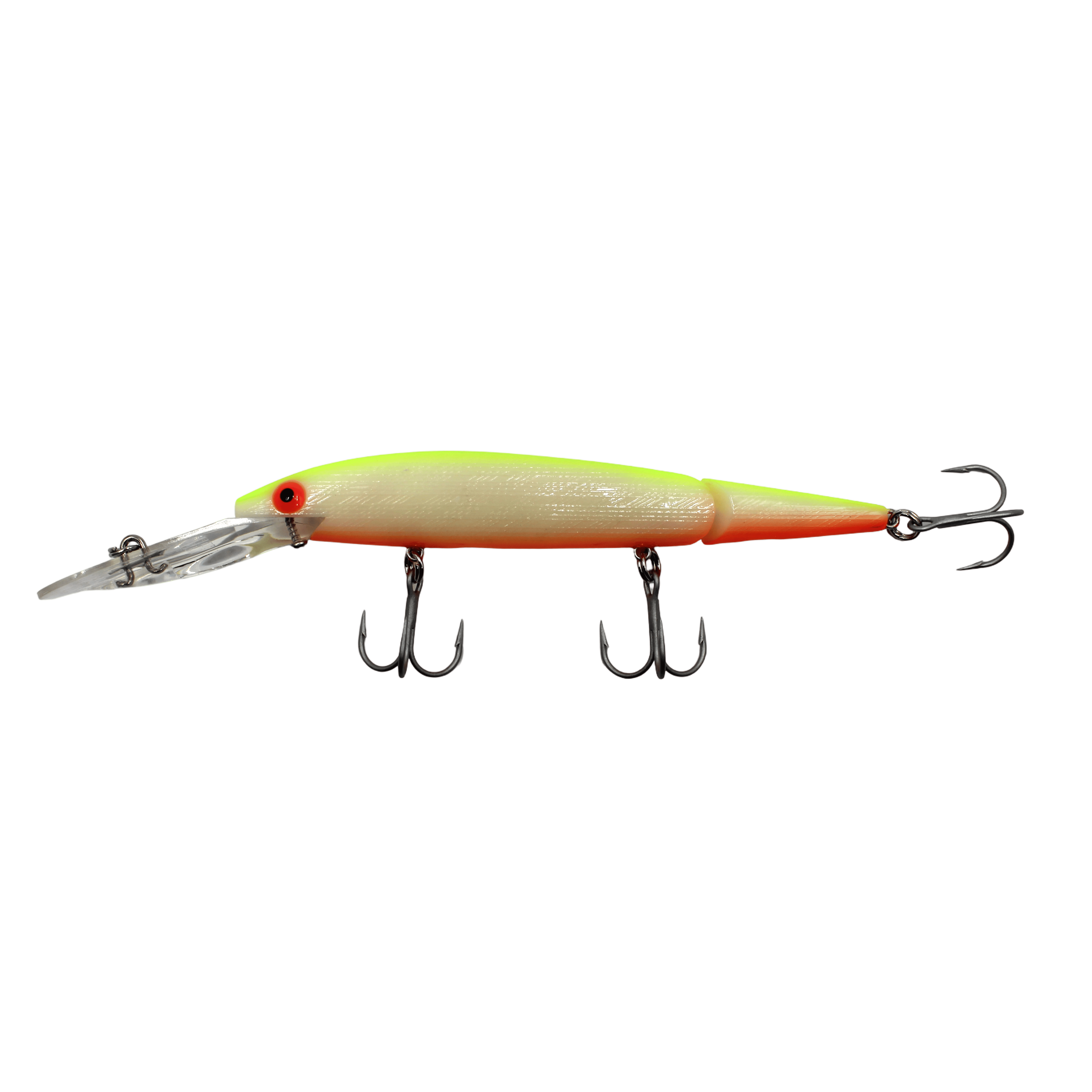 The Rebel Deep Jointed Minnow can be trolled for striper, and salmon, or twitched for cold weather bass. The big bill is tuned to run true right out of the package, and the super-strong hooks are corrosion-resistant to last a lifetime of fishing. These are a special run of this classic lure that is no longer in production. You won't find a better selection anywhere. Available in Rebel's most popular colors and a couple new patterns you haven't seen on this classic lure, such as bone white and chart/purple